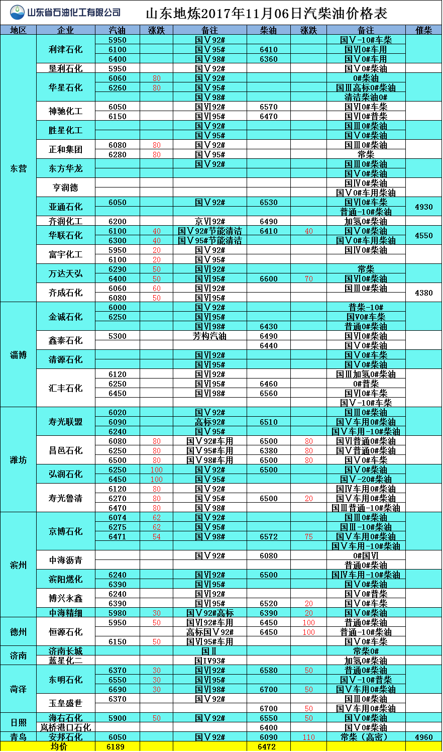 山東地?zé)?017年11月6日汽柴油價格表