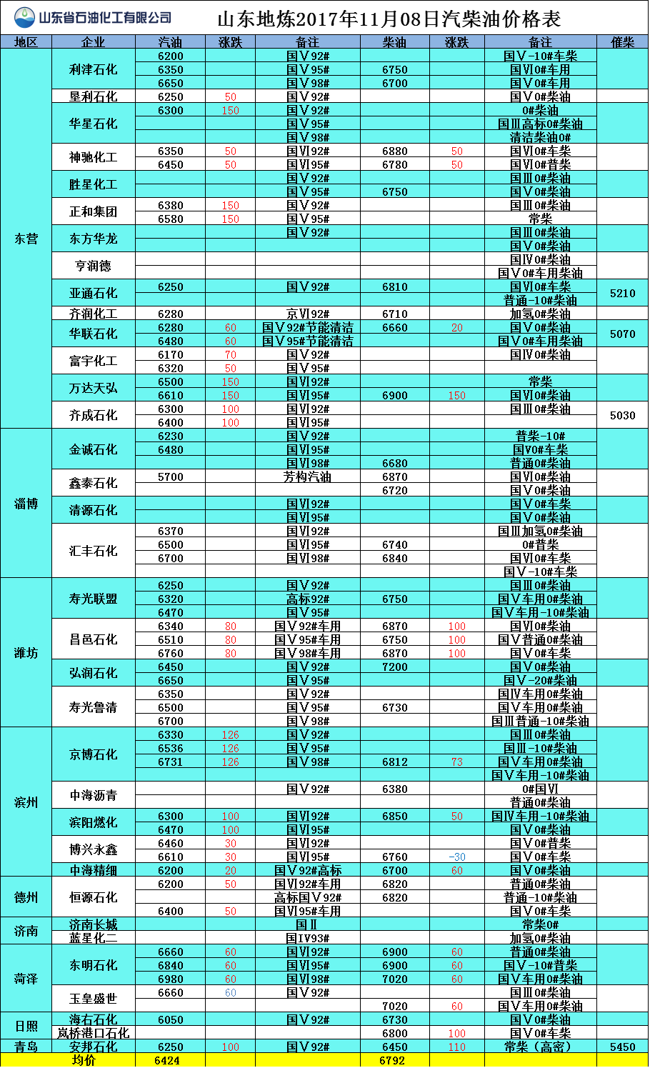山東地?zé)?017年11月7日汽柴油價格表