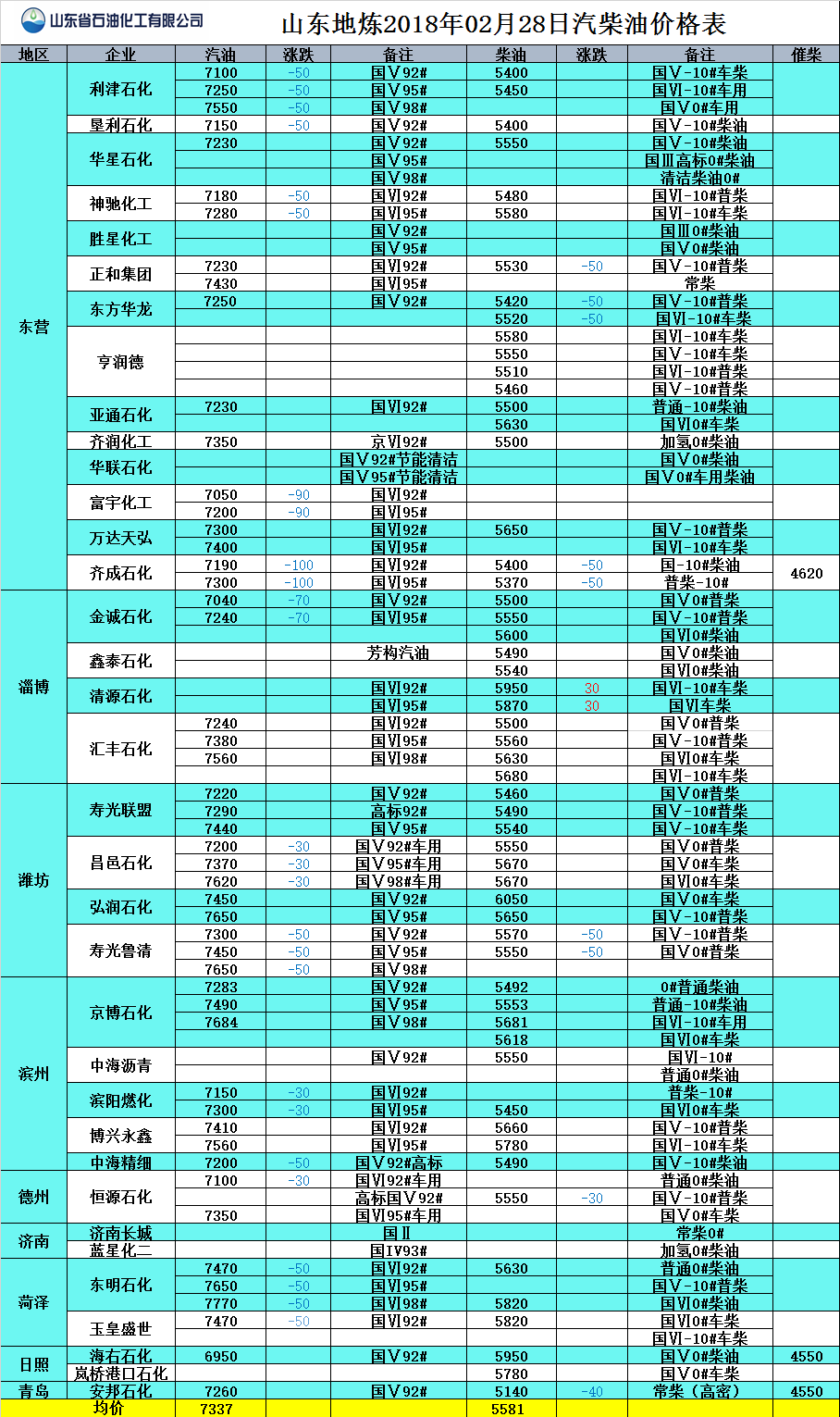 山東地?zé)?018年02月28日汽柴油價(jià)格表