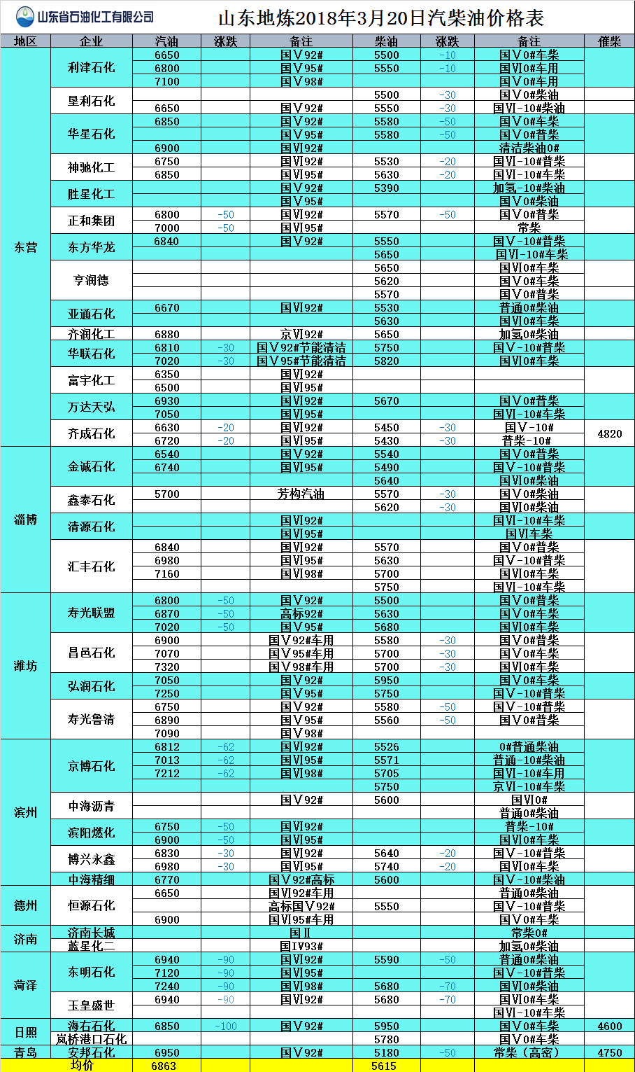 山東地?zé)?018年3月20日汽柴油價(jià)格表