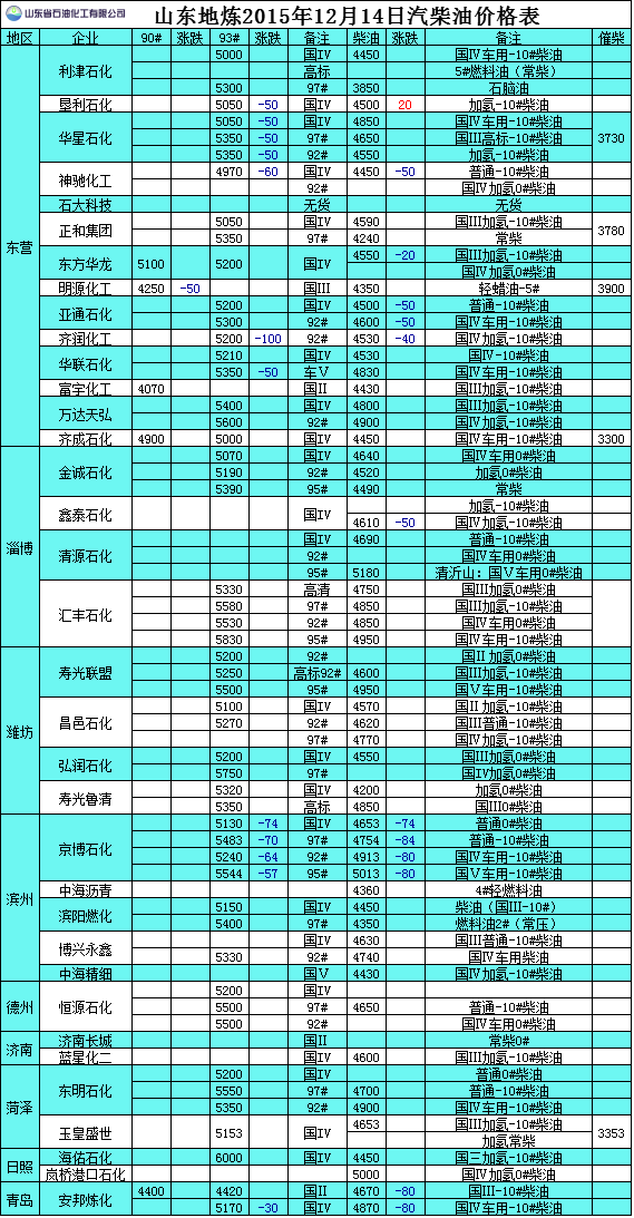 2015年12月14日山東地煉汽柴油價格表