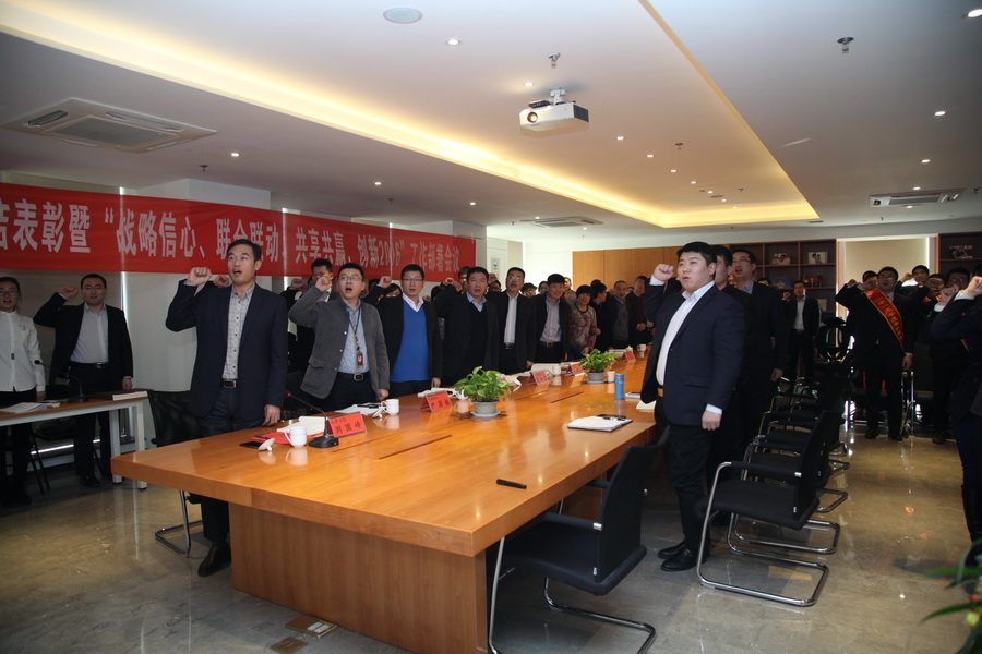 最后,公司全體人員進行宣誓:愛崗敬業(yè),誠實守信,戰(zhàn)略信心,務實拼搏,創(chuàng)新思維,團結(jié)協(xié)作,開拓進取,聯(lián)合聯(lián)動,搭建平臺,共享共贏,以客戶心為心,回報股東,奉獻社會!2016年,公司必將上下同欲,團結(jié)一心,繼往開來,再創(chuàng)輝煌!