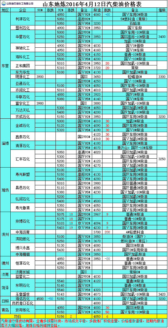 2016年4月12日山東地?zé)捚裼蛢r格表